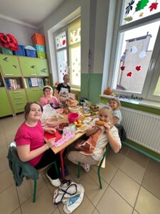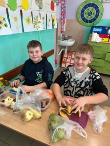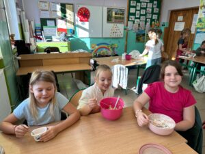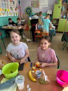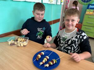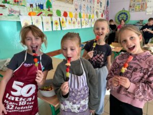 „Jedz zdrowo i kolorowo” to hasło przewodnie uczniów klasy 3 a SP, którzy wykonali sałatkę owocową. Każdy wie, jak ważne jest jedzenie owoców – nie tylko dlatego, że są smaczne, ale też przede wszystkim dlatego, że zawierają mnóstwo witamin, które chronią i wzmacniają nasz organizm. Uczniowie z przyniesionych owoców przygotowali zdrowe i smaczne sałatki oraz owocowe szaszłyki. Robienie sałatki owocowej sprawiło im wiele radości, ale też uświadomiło, że to co zdrowe, może być również pyszne, zwłaszcza wtedy, gdy zostanie zrobione własnoręcznie.
