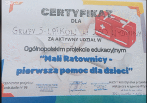 Ogólnopolski projekt edukacyjny „Mali Ratownicy – pierwsza pomoc dla dzieci” to projekt realizowany w grupie 5 – latków. Głównym zadaniem było zapoznanie dzieci z podstawową wiedzą z zakresu udzielania i wzywania pierwszej pomocy oraz kształtowanie odpowiednich zachowań w sytuacjach zagrożenia życia i zdrowia. Na zakończenie projektu otrzymaliśmy certyfikat.