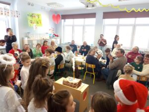 Po części artystycznej przyszedł czas na złożenie życzeń oraz wręczenie własnoręcznie przygotowanych podarunków. Następnie wszyscy zostali zaproszeni na wspólny poczęstunek. Nie zabrakło również tortu, przy którym cała sala wspólnie odśpiewała tradycyjne „Sto lat”.