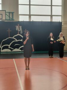 Spotkanie rozpoczęło się uroczystym powitaniem gości przez panią Dyrektor Dorotę Fiedorczyk, która w swoim przemówieniu podkreśliła znaczenie wartości chrześcijańskich w wychowaniu młodego pokolenia oraz rolę szkoły w kształtowaniu postaw opartych na szacunku, wierze i odpowiedzialności.